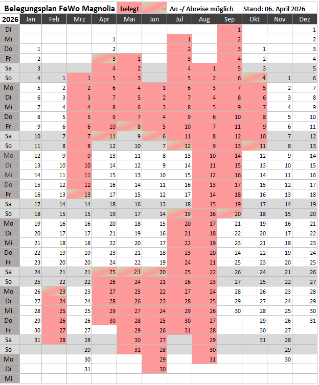 Für Ihre Buchung benötigen wir zur Sicherheit eine Anzahlung von 30 % des Buchungsbetrages. Die verbleibenden 70 % bitten wir, 2 Wochen vor Anreise zu überweisen. Bis 14 Tage vor dem Anreisetag können Sie unter Einbehalt von 20 % des Buchungsbetrages stornieren. Sollten wir die Wohnung für den gleichen Zeitraum wieder vermieten können, erstatten wir Ihnen gerne den Stornobetrag. Wir empfehlen Ihnen eine Reiserücktrittversicherung bei einem Ihrer bevorzugten Versicherer abzuschließen.